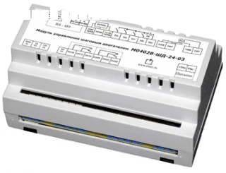 Модуль управления шаговым двигателем М0402В-ШД-24-03 применяется для управления по сигналам из сети RS-485 (по протоколу ModBus-RTU) шаговым двигателем, встроенными дискретными выходными элементами, используемыми для подключения исполнительных механизмов с дискретным управлением, и сбора данных с дискретных входов модуля с передачей их в сеть RS-485 (по протоколу ModBus-RTU). Выпускается в пластмассовом корпусе, предназначенном для крепления нa DIN-рейку шириной 35 мм.