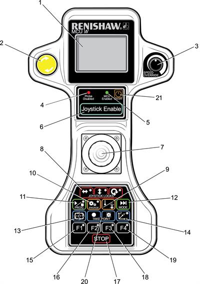 Жёлтая кнопка STOP (Останов) отключает питание от осей КИМ, останавливает движение приводных головок и блокирует головки в их текущем положении.